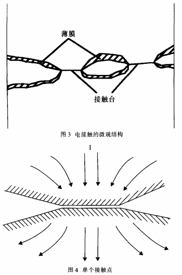 要知道在母线槽联接处的电阻,除了母线槽自身存在的电阻外,还存在一个接触电阻。这是因为:不管母线槽表面处理得怎样光滑平坦,在微观环境下,母线槽表面也是凹凸不平的,如图3所示,两片母线槽之间的搭接实践上只要母线槽表面上许多小尖峰之间的接触,电流流过搭接面的实践面积减少了,电流线发生严峻的缩短现象,发生缩短电阻R,取其中一点剖析其结构如图4所示。另一方面,母线槽从加工结束到装在开关柜里有必定的时间差,很简单因为暴露在空气里而构成一层薄膜(如氧化膜等),使电阻增大,称为膜电阻R,。所以接触电阻实践上是由这两部分组成,即