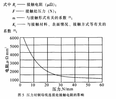 由公式(2)可知,影响母线槽搭接面接触电阻的主要因素有表面的条件K、m和所施加的压力F。当母线槽表面处理和接触面积确认了,则Kj、m也确认了,于是接触电阻Rj与压力F成为反比联系,压力F越大,接触电阻Rj越小。图5是压力对两片铜导体联接处接触电阻的影响曲线图。