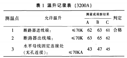 表2是温升实验室的质检人员按照国家规范GB7251.1-1997的有关条款对该样柜进行温升实验,对整个母线槽系统的关键处和搭接面进行丈量(测得部分温升记载)