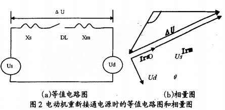 图2所示为电动机从头接通电源时的等值电路图和相角图,从图中能够看出,不同的0角(电源电压和电动机残压二者之间的夹角),对应不同的△U值,如0=180o时,AU值最大,假定此刻从头合上电源,对电动机的冲击最严峻。依据母线槽上成组电动机的残压特性和电动机耐受电流的才干,在极坐标上可绘出其残压曲线。