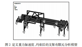 3载荷,绑缚的仿照定义重力加速度9800mm/s2,在支架立柱底端及其他相应方位施加绑缚。如图2所示,为定义重力加速度,绑缚后的ANSYS仿真图。