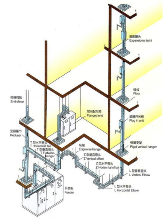 前端母线,为电源引入单元,可直接与变压器或低压配电屏联接。变容量节,为母线改换容量时的过渡节。