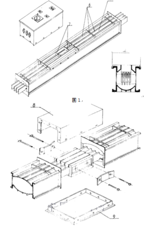通过对母线槽的改良设计,在母线槽的盖板、侧板连接处、插口处、接头处都设计防水结构,设置防水嵌件。如图1:利用插口处加强筋的凸起部分(7)和插接箱底部的凹槽相配合,以解决插口处的防水问题。如图2:用接头防水上罩(8)和接头防水底板(9)与母线槽相配合,已解决解决接头处的防水问题。
