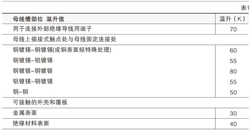 母线槽各部位温升不应超出表1规定,特殊情况下在不影响绝缘材料的绝缘性能和使用寿命时,可适当提高温升。